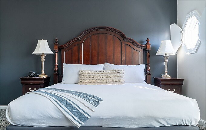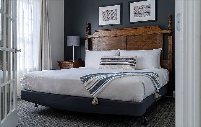 The East Wing's vintage furniture meets contemporary comforts with Cuddledown duvets, feather pillows, and a custom-made king Serta Mattress.